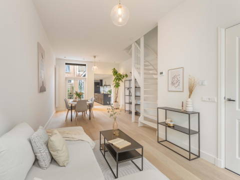 De keuken grenst ook aan de woonkamer en deze is in 2024 geheel vernieuwd en is voorzien van een prachtig inductiefornuis met ingebouwde afzuiging, combi-oven en een ingebouwde was-droogmachine.